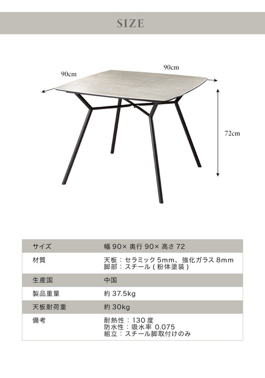 セラミック ダイニングテーブル 幅90cm 正方形 作業台 セラミックテーブル スチール脚 マーブル調 石目調 モノトーン 丈夫 頑丈 メンテナンスフリー(代引不可)