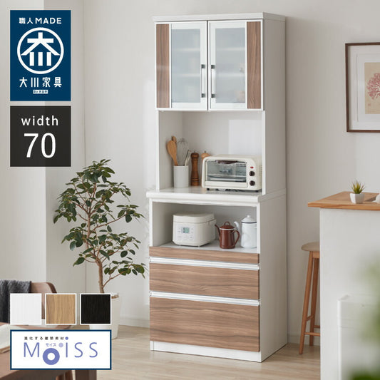 食器棚 キッチンボード 幅70 奥行48 高さ203 完成品 国産 モイス加工 レンジ台 レンジボード 大容量 ソフトクローズ キッチン 収納 木目 フルオープンレール ホワイト 白 キングウッド(代引不可)