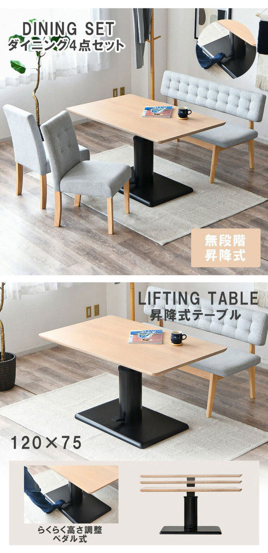 ダイニングセット 4点セット 昇降テーブル ベンチ チェア 昇降式テーブル 高さ調整 長方形 ダイニングテーブルセット 4人用 ベンチ 長椅子 背もたれ 2脚セット カフェテーブル(代引不可)