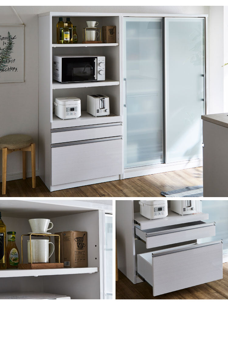 スリムでも抜群の収納力: 幅70cmとコンパクトながら、可動棚付きのオープンスペースと深さのある引出しを備え、家電からキッチン小物まで効率よく収納できます。