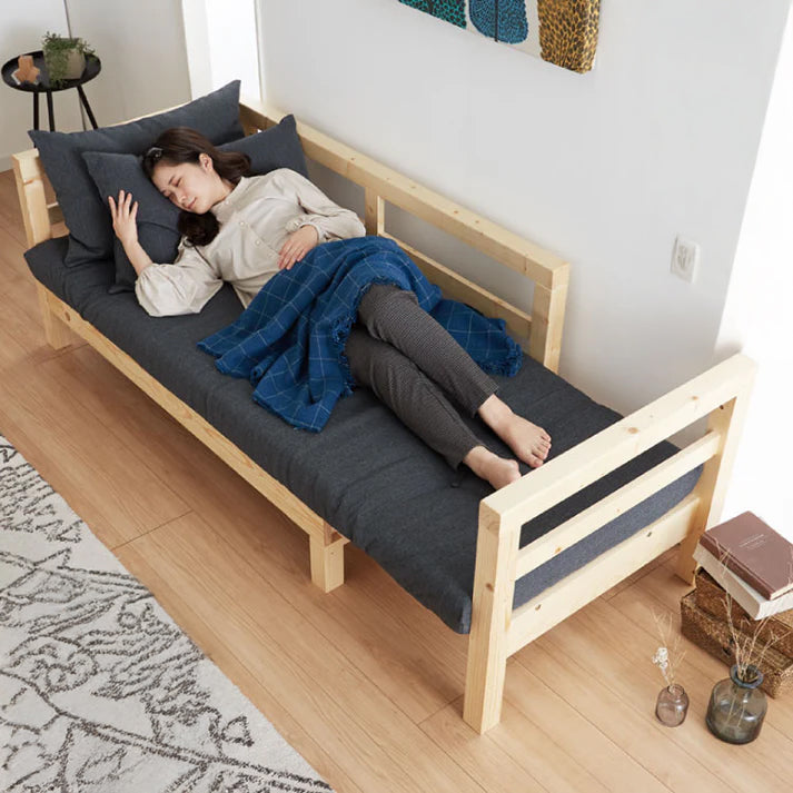 北欧パイン材のフレームは無段階で長さ調節可能。最大まで伸長させれば、セミシングルサイズのすのこベッドや3人掛けソファになります。