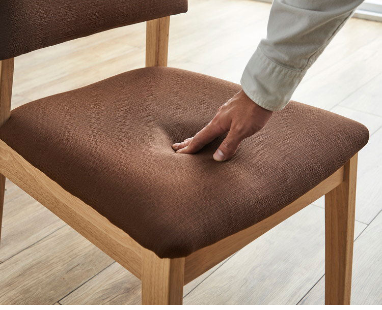 「天然木のぬくもりが家族を繋ぐ。オークの質感を楽しむ北欧ナチュラルなダイニングセット」 美しい木目のオーク突板を使用したテーブルと、座り心地にこだわったファブリックチェアをコーディネート。