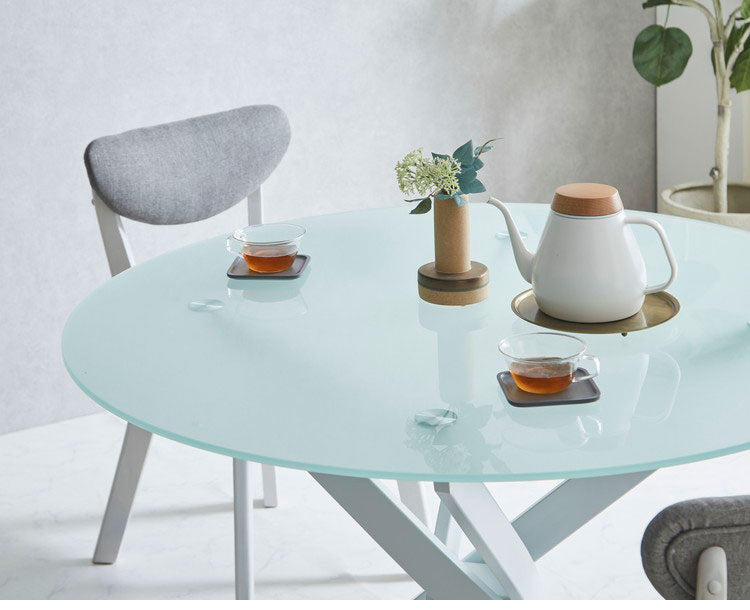 お部屋を華やかに彩る「強化ガラス天板」:天板には安心の10mm厚強化ガラスを採用しています。ガラスならではの透明感が空間の圧迫感を軽減し、お部屋を広く見せる効果があります。
