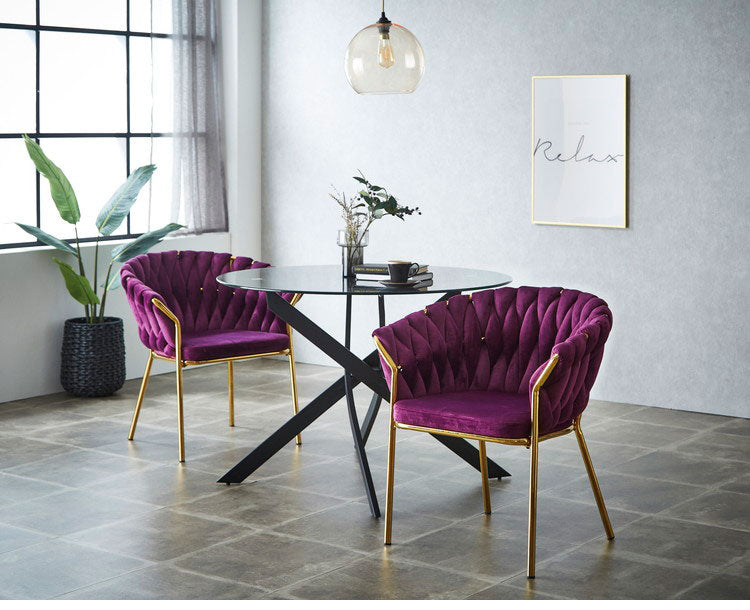 「空間を贅沢に彩る、透明感。個性的なクロス脚が目を引くモダンダイニング」 10mm厚の強化ガラスを使用した「ルイーズ」は、圧迫感を感じさせない軽やかなデザインが魅力です。お部屋の主役となるアーティスティックな脚部が、洗練されたカフェのような空間を演出します。