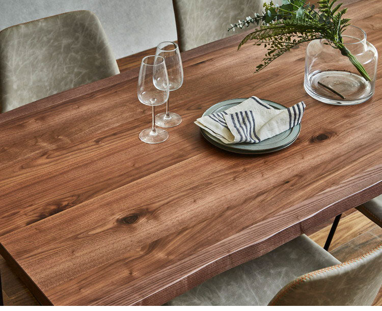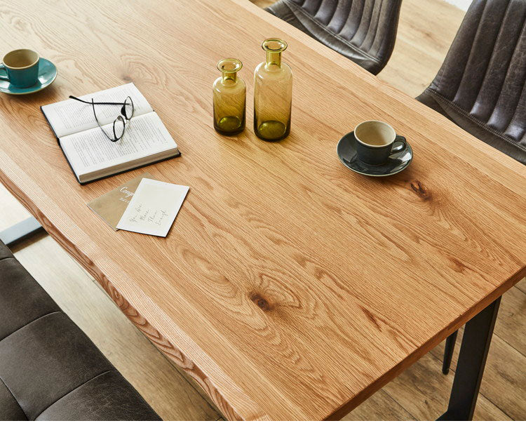 天然木の質感を活かしたオーク・ウォールナットの突板を使用。天板の縁には波打つ「耳付き」加工を施し、まるで本物の一枚板のような重厚感と自然の造形美を再現しました 。天板厚は約4cmとしっかりとしたボリュームがあり、ダイニングに高級感を演出します。