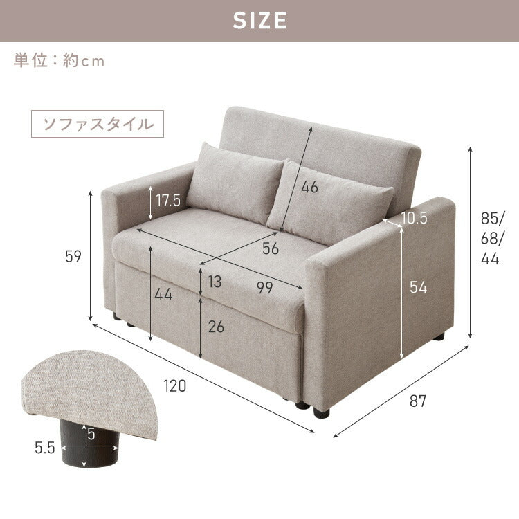 3way ソファーベッド 2人掛け 幅120 カウチ コンパクト ペット生地 リクライニング キャスター付き 肘付き ファブリック スライド式 ソファベッド カウチソファ ベッド クッション付き リビング 伸縮