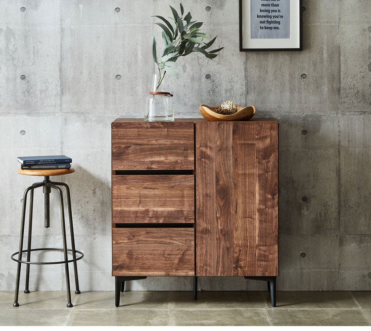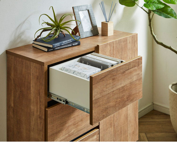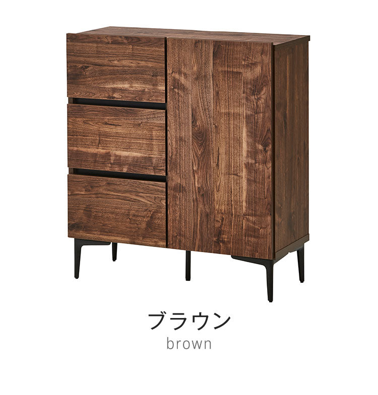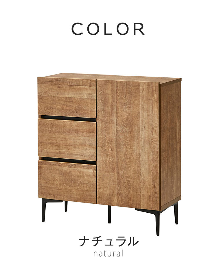 開き扉にはソフトクローズが取り付けられており、扉が静かに閉まります。フラットデザイン、34cmの奥行で手狭な場所でも邪魔になりません。スチール製の高さ15cmの黒脚付きで床のお掃除も簡単。天板の後方にはテレビの配線などを逃がすためのスリットがついているので壁にぴったりくっつけても配線を通すことが出来ます。引き出しのレールはフルオープンレール仕様なので手前までしっかり引き出すことが出来ます。棚板は可動式となっており、3枚付属しております(ダボ穴は6cmピッチで8穴)。装飾性の高い美しい木目調のカラーが大きな特徴です。