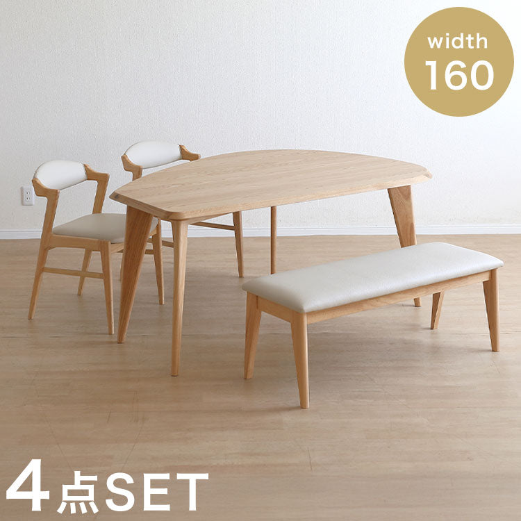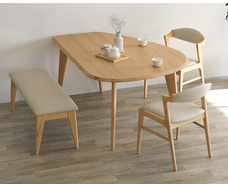 テーブル×チェア(2脚)×ダイニングベンチのダイニングセットです。どんな部屋にもフィットしやすく、座る場所を選ばない万能テーブルです。椅子は天然木を使用した、ナチュラルテイストのダイニングチェアです。背もたれのカーブが背中にフィットし、かつ背もたれが高いのでゆったり座れます。ベンチはナチュラルテイストで座面幅は115cmと、2名でもゆったり座れます。