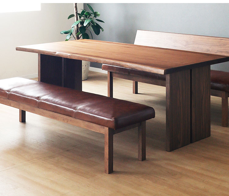ウォールナット素材と木脚の組み合わせの160cm幅一枚板風のテーブルです。天厚4cmの重厚感と、天然杢ノタ面の本来の木の風合い、そして天板は1cm厚の単板を使用することにより木目がしっかりと出て高級感が感じられます。
