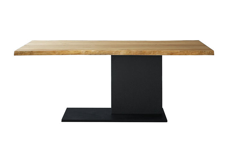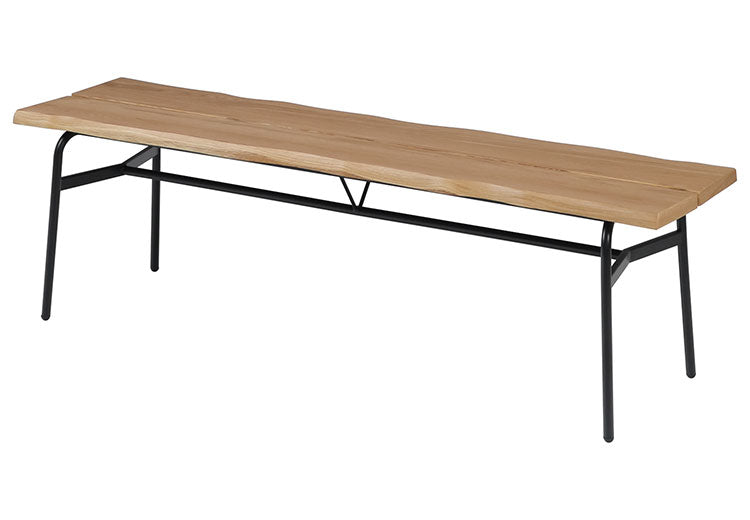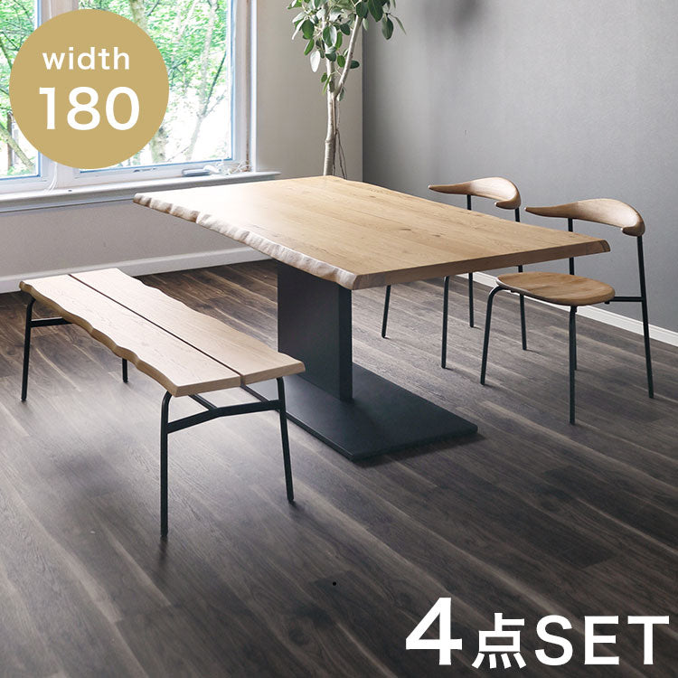180cm幅ダイニングテーブル×ダイニングチェア(2脚)×150cm幅ベンチのオーク素材を使ったダイニングセットです。テーブルはオーク素材、一枚板風のテーブルです。天厚4cmの重厚感と、天然杢ノタ面の本来の木の風合い、そして天板は1cm厚の単板を使用することにより木目がしっかりと出て高級感が感じられます。脚も特殊なL字型の真ん中脚になっており、デザイン性もありつつ、どこに座っても脚が干渉しない使いやすさを金そろえております。チェアはオーク素材を使用した板座のチェアです。座面はさくりをとっております。スタッキング(積み重ねる)が可能です。ベンチは150cm幅でオーク素材を使用した板座のベンチです。ベンチの両側はテーブルに合わせてノタ面風のNC加工(削り)が施されております。