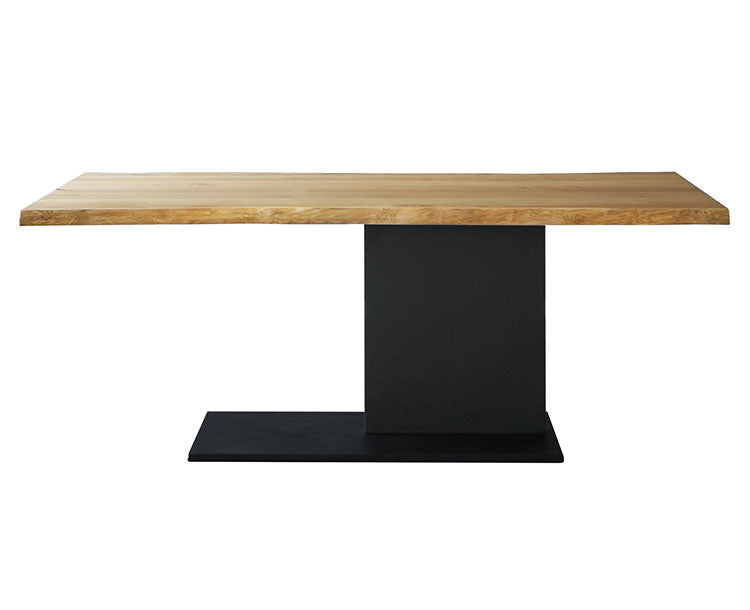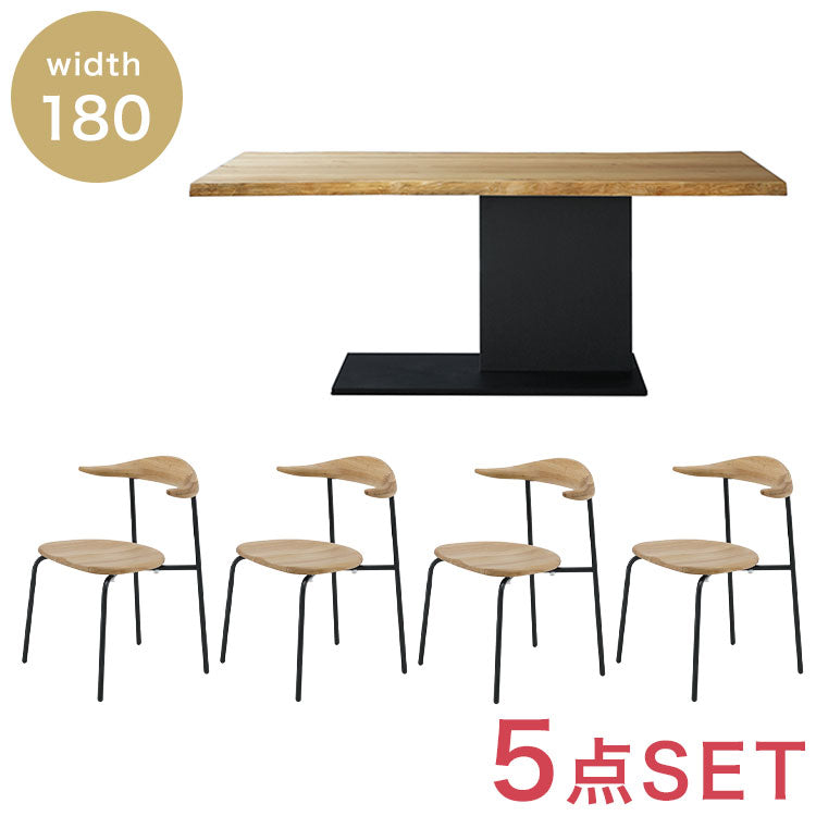 180cm幅ダイニングテーブル×ダイニングチェア(4脚)のオーク素材のダイニングセットです。テーブルはオーク素材、一枚板風のテーブルです。天厚4cmの重厚感と、天然杢ノタ面の本来の木の風合い、そして天板は1cm厚の単板を使用することにより木目がしっかりと出て高級感が感じられます。脚も特殊なL字型の真ん中脚になっており、デザイン性もありつつ、どこに座っても脚が干渉しない使いやすさを金そろえております。チェアはオーク素材を使用した板座のチェアです。座面はさくりをとっております。スタッキング(積み重ねる)が可能です。