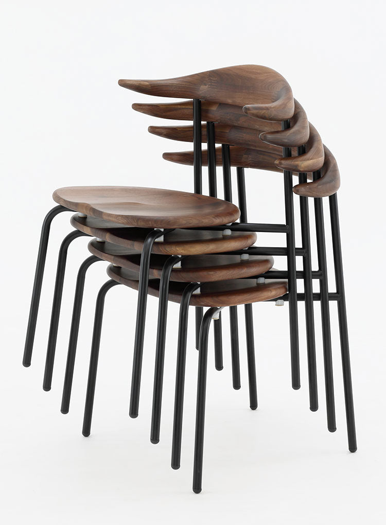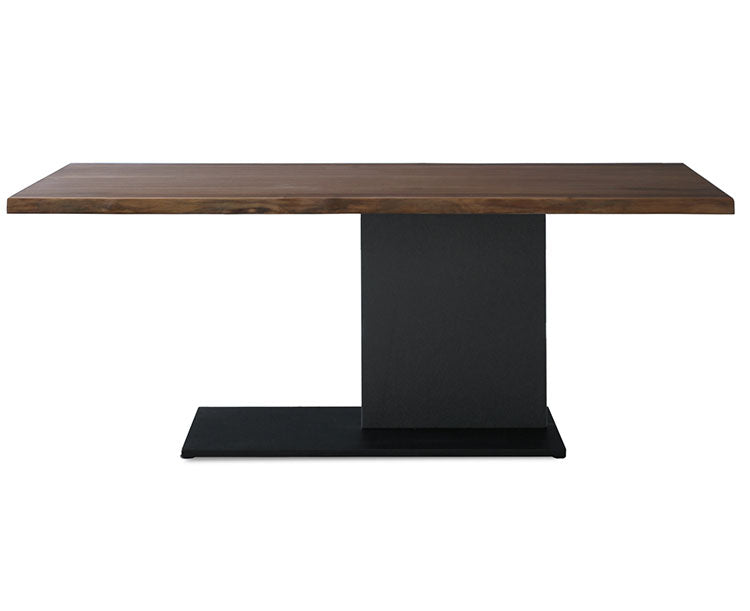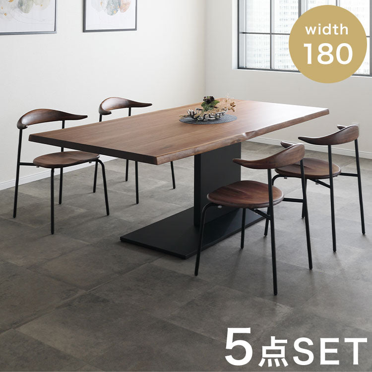 180cm幅ダイニングテーブル×ダイニングチェア(4脚)のウォールナット素材のダイニングセットです。テーブルはウォールナット素材、一枚板風のテーブルです。天厚4cmの重厚感と、天然杢ノタ面の本来の木の風合い、そして天板は1cm厚の単板を使用することにより木目がしっかりと出て高級感が感じられます。脚も特殊なL字型の真ん中脚になっており、デザイン性もありつつ、どこに座っても脚が干渉しない使いやすさを金そろえております。チェアはウォールナット素材を使用した板座のチェアです。座面はさくりをとっております。スタッキング(積み重ねる)が可能です。