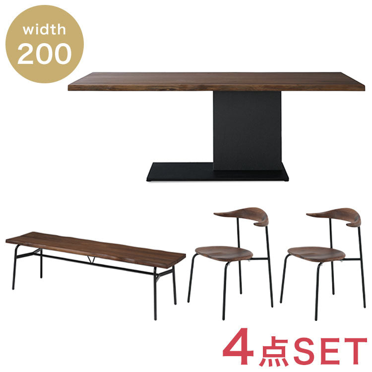200cm幅ダイニングテーブル×ダイニングチェア(2脚)×180cm幅ベンチのウォールナット素材を使ったダイニングセットです。テーブルはウォールナット素材、一枚板風のテーブルです。天厚4cmの重厚感と、天然杢ノタ面の本来の木の風合い、そして天板は1cm厚の単板を使用することにより木目がしっかりと出て高級感が感じられます。脚も特殊なL字型の真ん中脚になっており、デザイン性もありつつ、どこに座っても脚が干渉しない使いやすさを金そろえております。チェアはウォールナット素材を使用した板座のチェアです。座面はさくりをとっております。スタッキング(積み重ねる)が可能です。ベンチは180cm幅でウォールナット素材を使用した板座のベンチです。ベンチの両側はテーブルに合わせてノタ面風のNC加工(削り)が施されております。