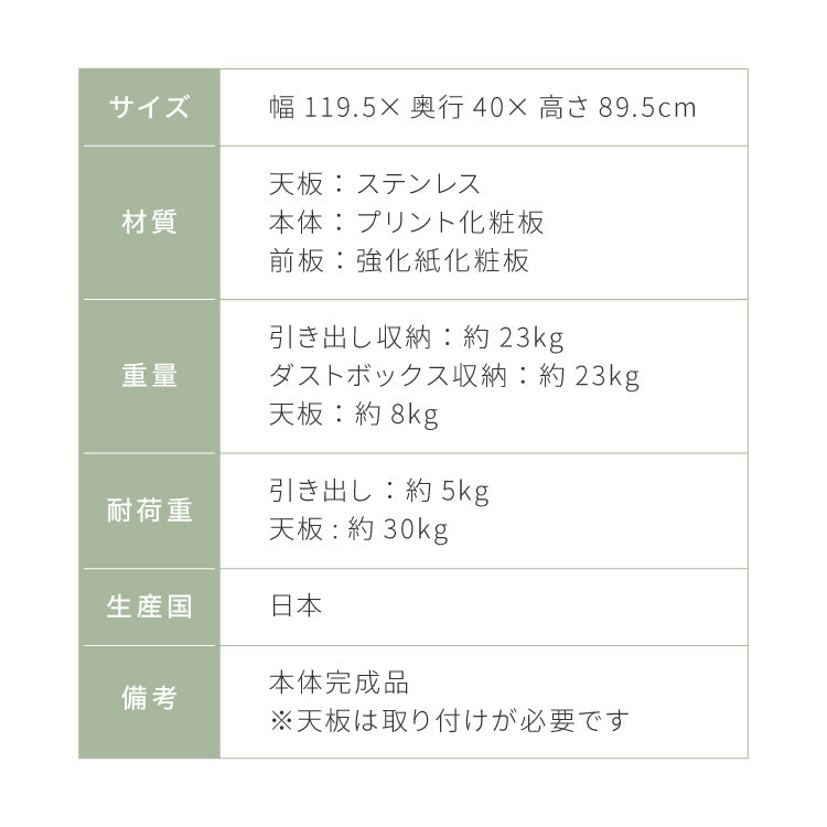 キッチンカウンター 幅120 完成品 日本製 ゴミ箱 引き出し ステンレス 天板 キッチンラック キャビネット サイドボード ダストボックス モダン ナチュラル セラミック調 国産 大川家具(代引不可)