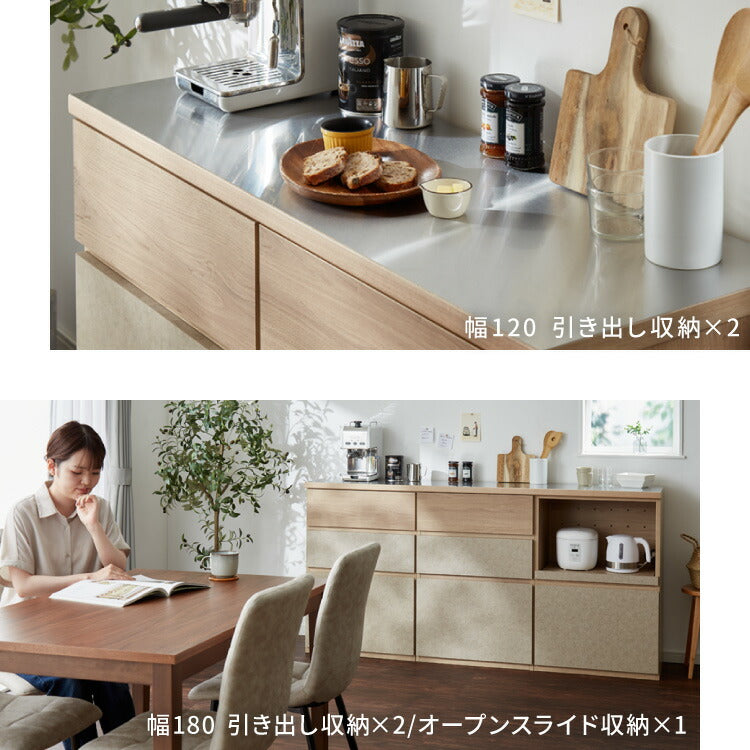 キッチンカウンター 幅180 完成品 日本製 引き出し ステンレス 天板 キッチンラック キャビネット サイドボード モダン ナチュラル セラミック調 国産 大川家具(代引不可)