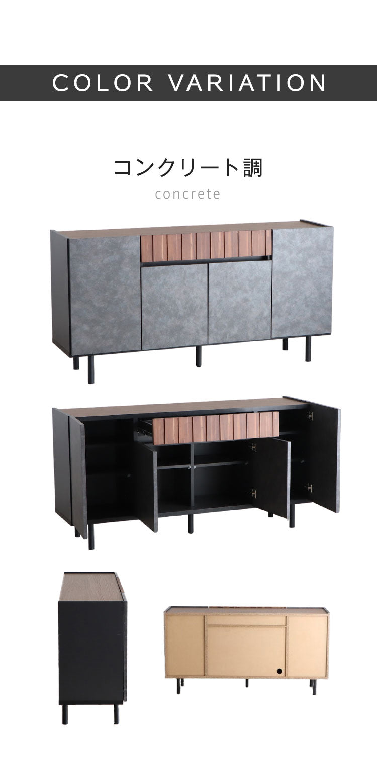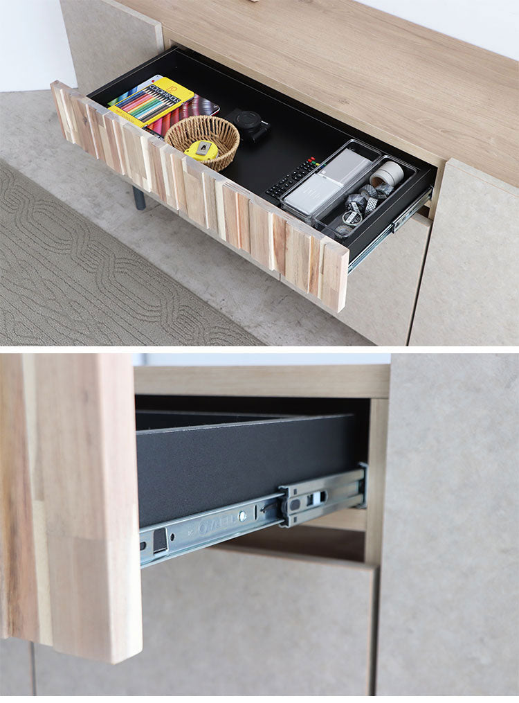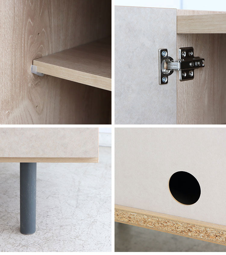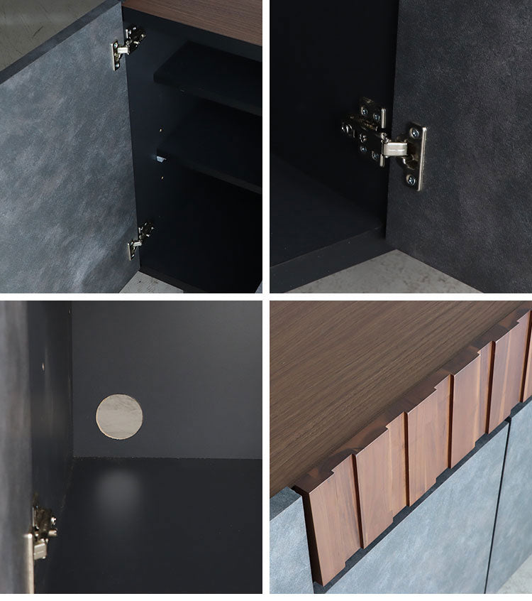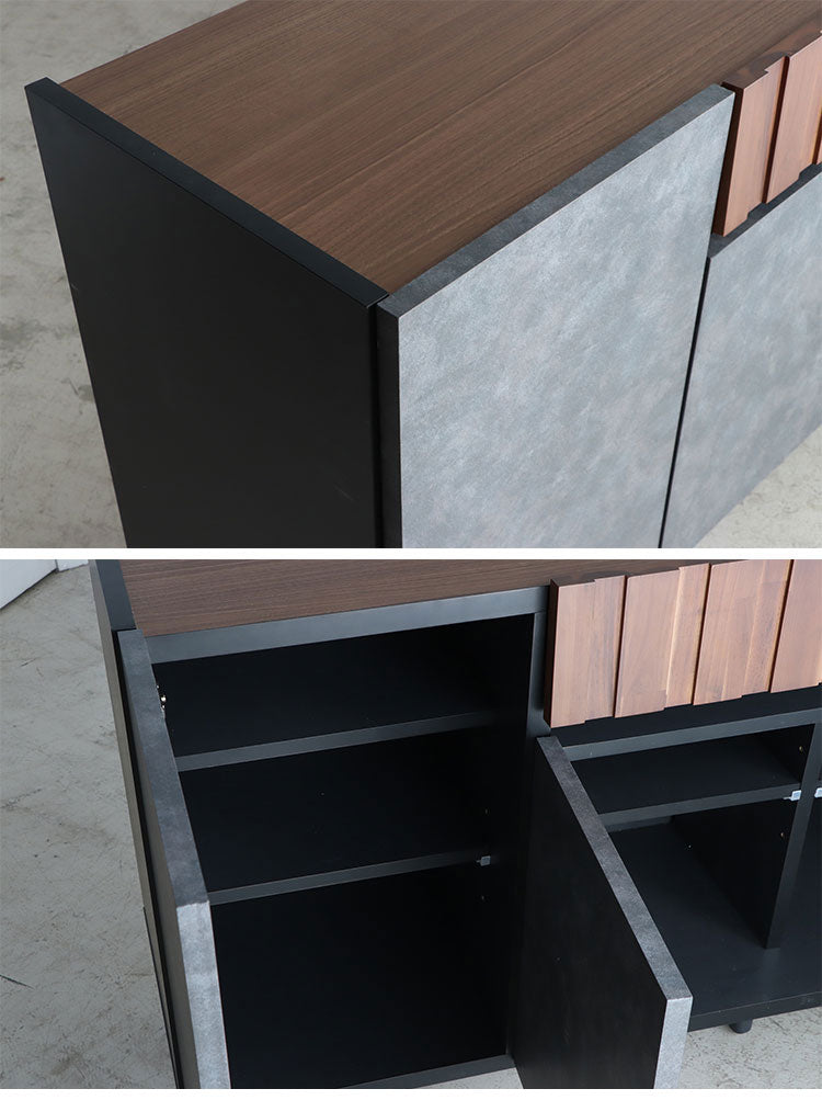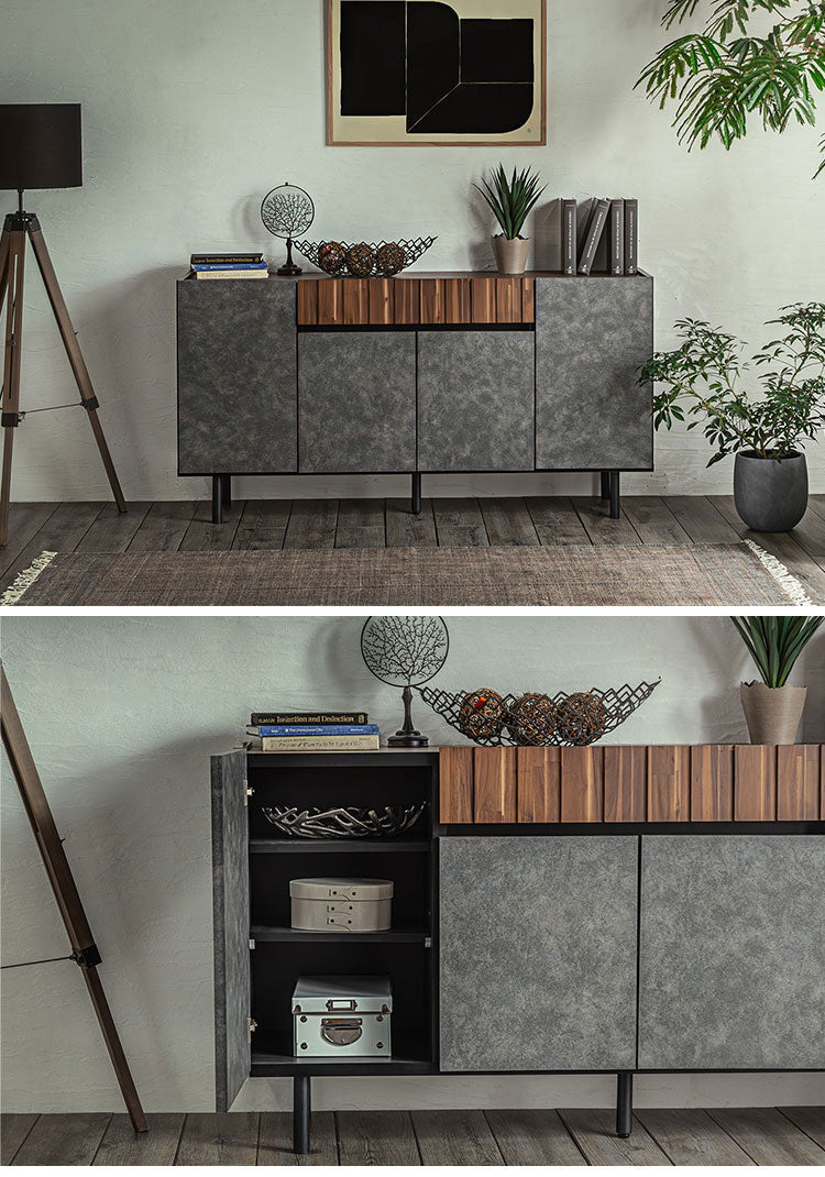 モルタル調の前板とブラウン木目が特徴的な家具シリーズ。都会的なスマートさを感じさせるデザインで、暖色系のダウンライトなどといった照明などで演出すると大人かっこいい空間を演出することができます。