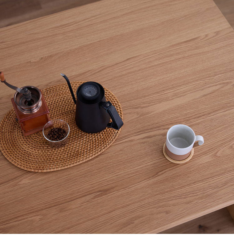 片側は直線に、片側は丸みがかかったデザイナーズテーブルです。片側は直線なので壁にぴったりとつけて使用することができ、空間をすっきりと演出します。角がないことで通路を歩きやすくなったり、脚も内側に入っているので邪魔になりにくい設計となっています。ダイニングチェアはオーク材無垢のシンプルな肘無しチェアです。
