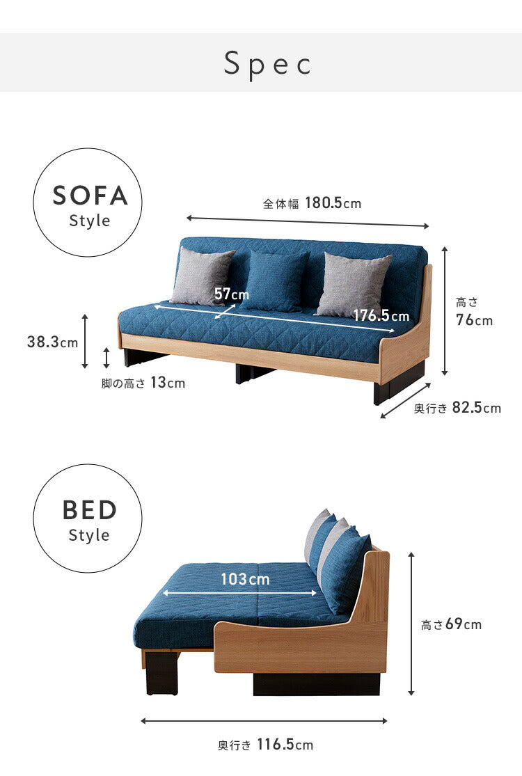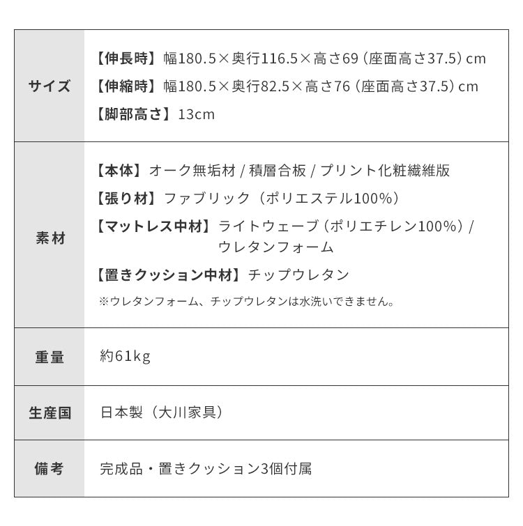 [伸縮時]幅180.5×奥行82.5×高さ76(座面高さ37.5)cm