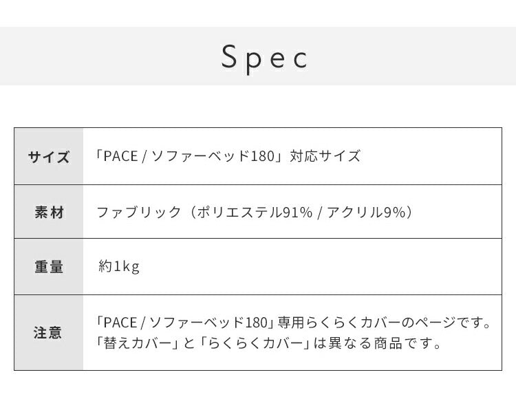 「PACE / ソファーベッド180」専用らくらく替えカバーのページです。